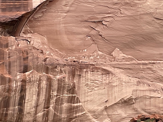 One of the most famous murals was not produced by the Anasazi but came from later inhabitants, perhaps Hopi or Zuni ancestors and is dated from the late 1500 or early 1600s. It is a large painting chronicling the arrival of Spanish conquistadors and their horses. There are several figures wearing capes and helmets, carrying long lances and riding horses. One of the figures has the sign of a cross on his cape, either indicating he was a priest or possibly the leader of the procession. The artwork and symbology are in such detail that the subject and significance are unmistakable.