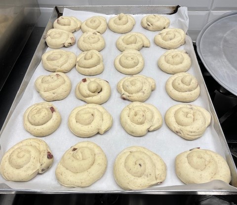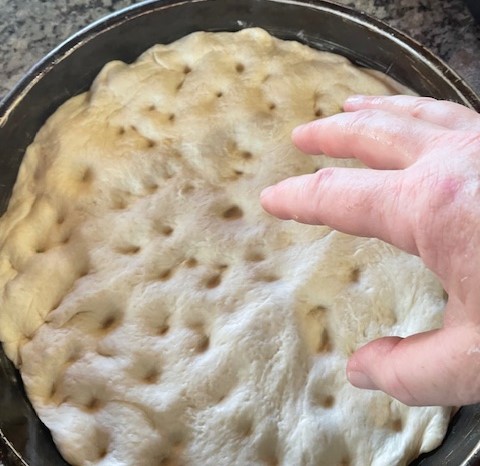 For focaccia, carefully hand stretch the happy rising ball into a disc matching the size of the pan. Spread it into the bottom of the pan with your fingers by pushing the dough evenly across the bottom of the pan to the edges. Let the dough rise twice, maybe three times. Put the pans with the dough in a warm area of the kitchen (we had a proofing oven) or we stacked the pans on a shelf above the stove/oven. Our kitchen was warm. If you have the air conditioner running in your kitchen you might need to use a proofing drawer. Check the dough in 15 minutes; it’s probably ready to be pushed down.