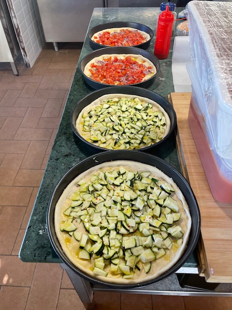 For pizza, roll the dough or hand toss to be slightly bigger than the pan. Fold the edges down and crimp or pinch to create the crust handle. The pizza dough does not need to rise again, slather with olive oil, tomato sauce, cheese, whatever your chosen ingredients are, and bake. We generally used non-meat ingredients on our pizza as this was part of our appetizer antipasti tasting plate. One of our favorite ingredients was thin sliced zucchini. Try not to add too many ingredients. Ever present is Chef Lorenzo’s direction “Don’t exaggerate!” And, basil is only added after the baking. Pizza takes less time to bake, maybe 10-15 minutes…depending on how the oven is behaving.